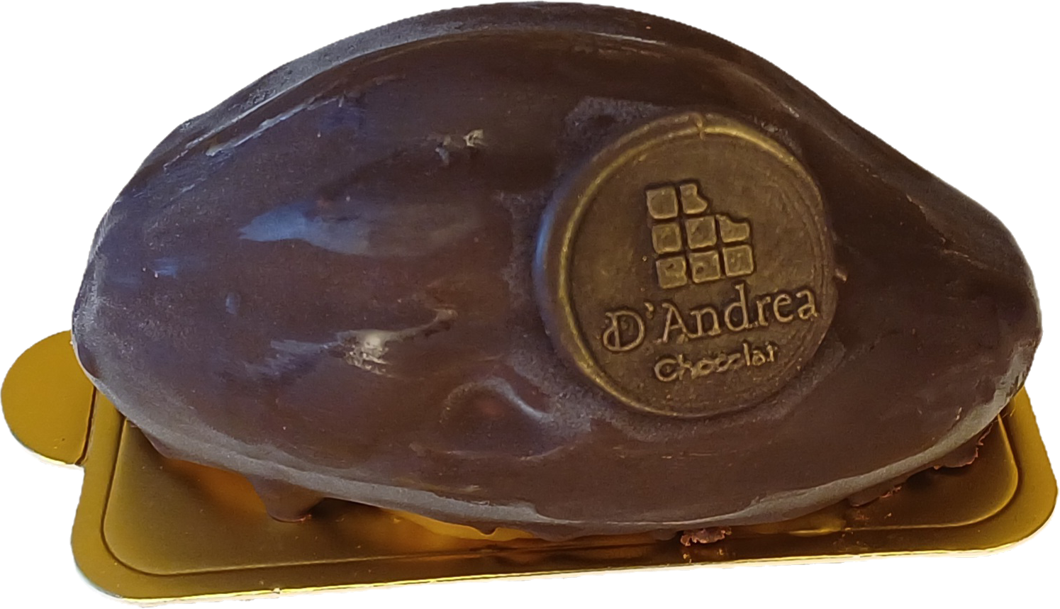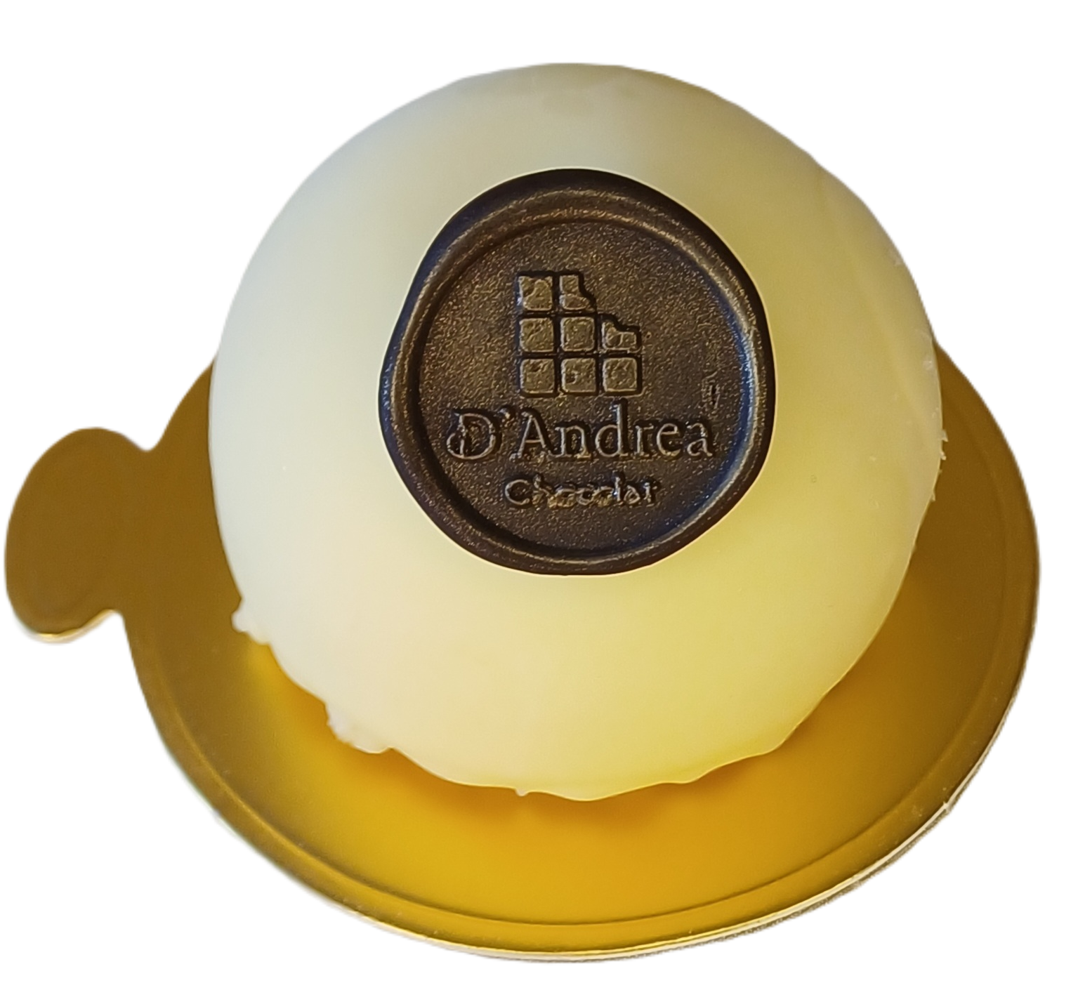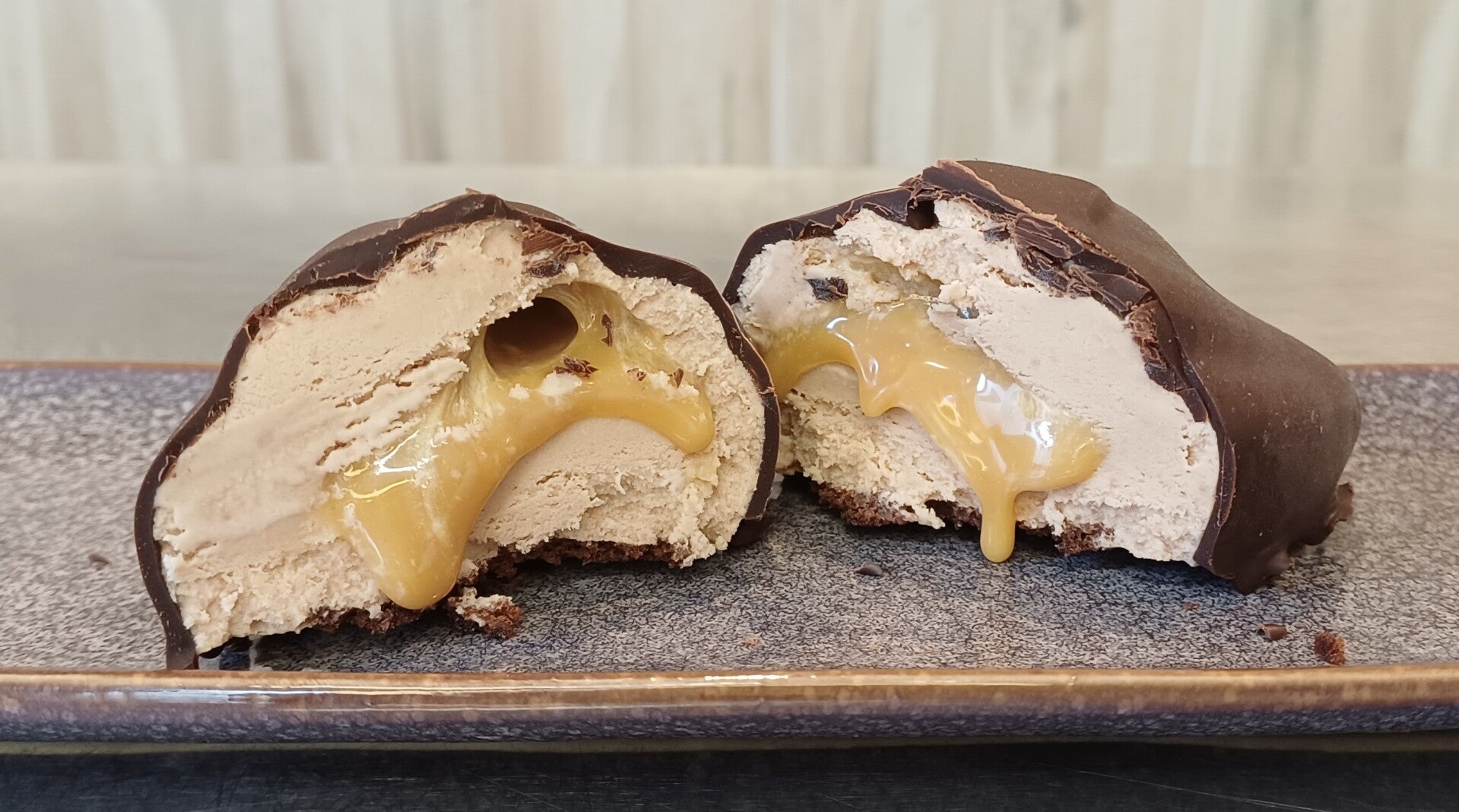 - Cabosse glacée au chocolat au lait, renfermant un cœur fondant au caramel beurre salé, délicatement enrobée de chocolat noir craquant et dressée sur un brownie moelleux.